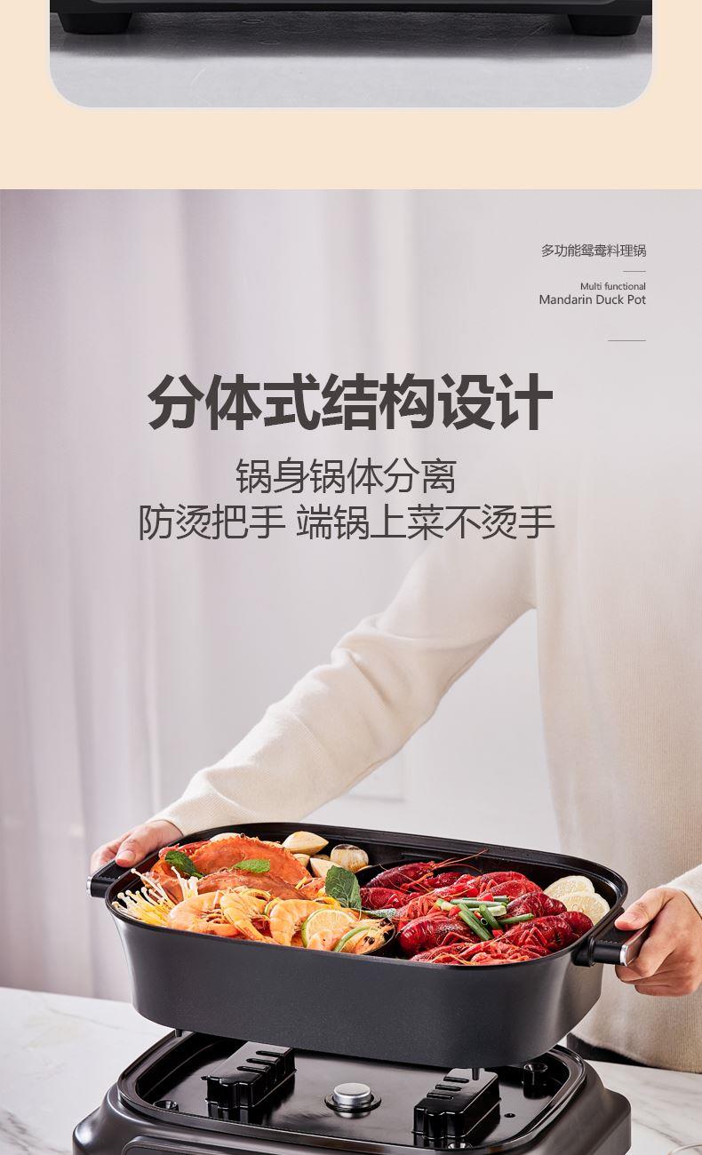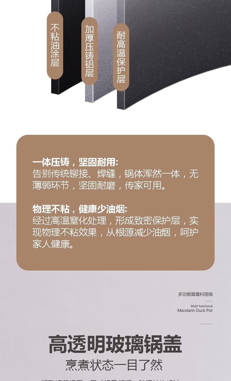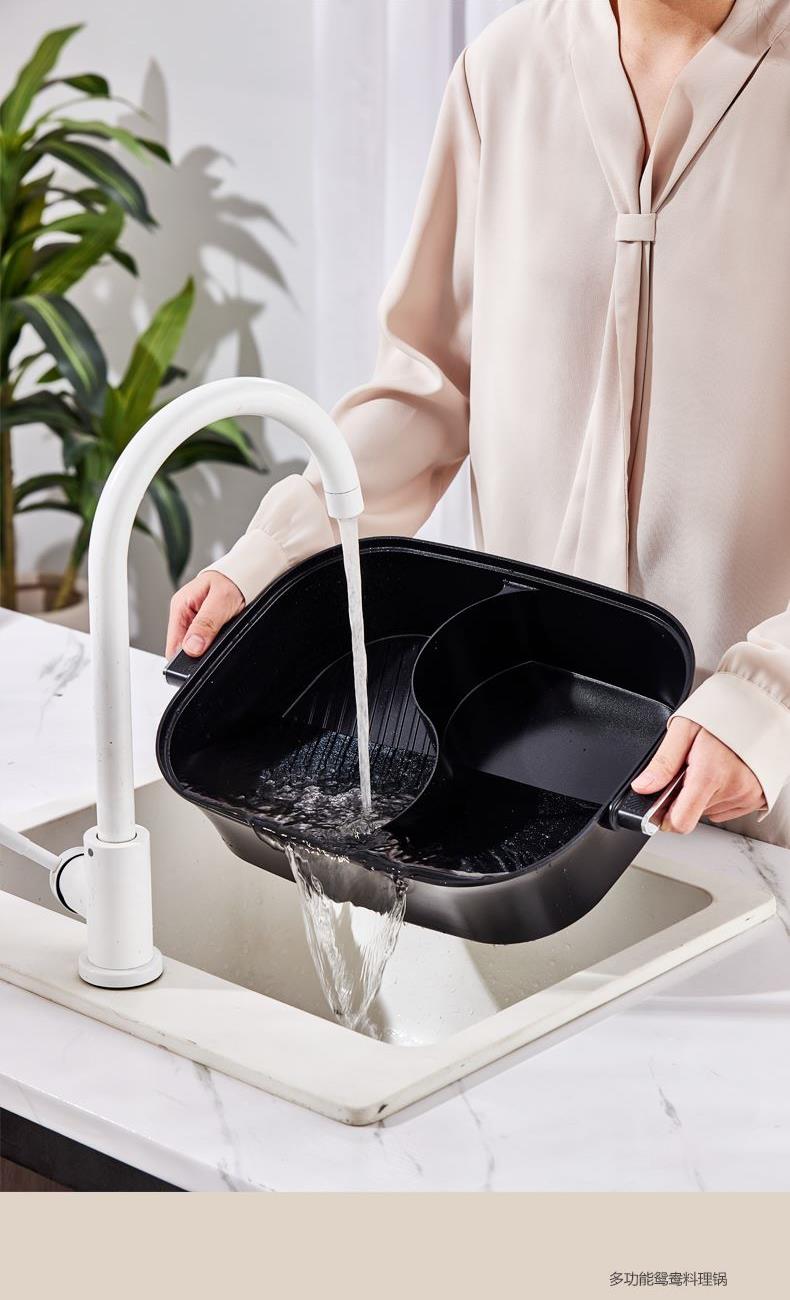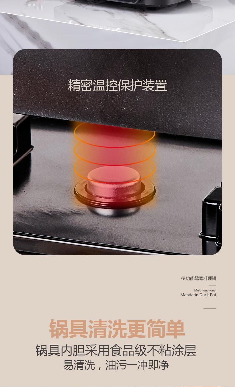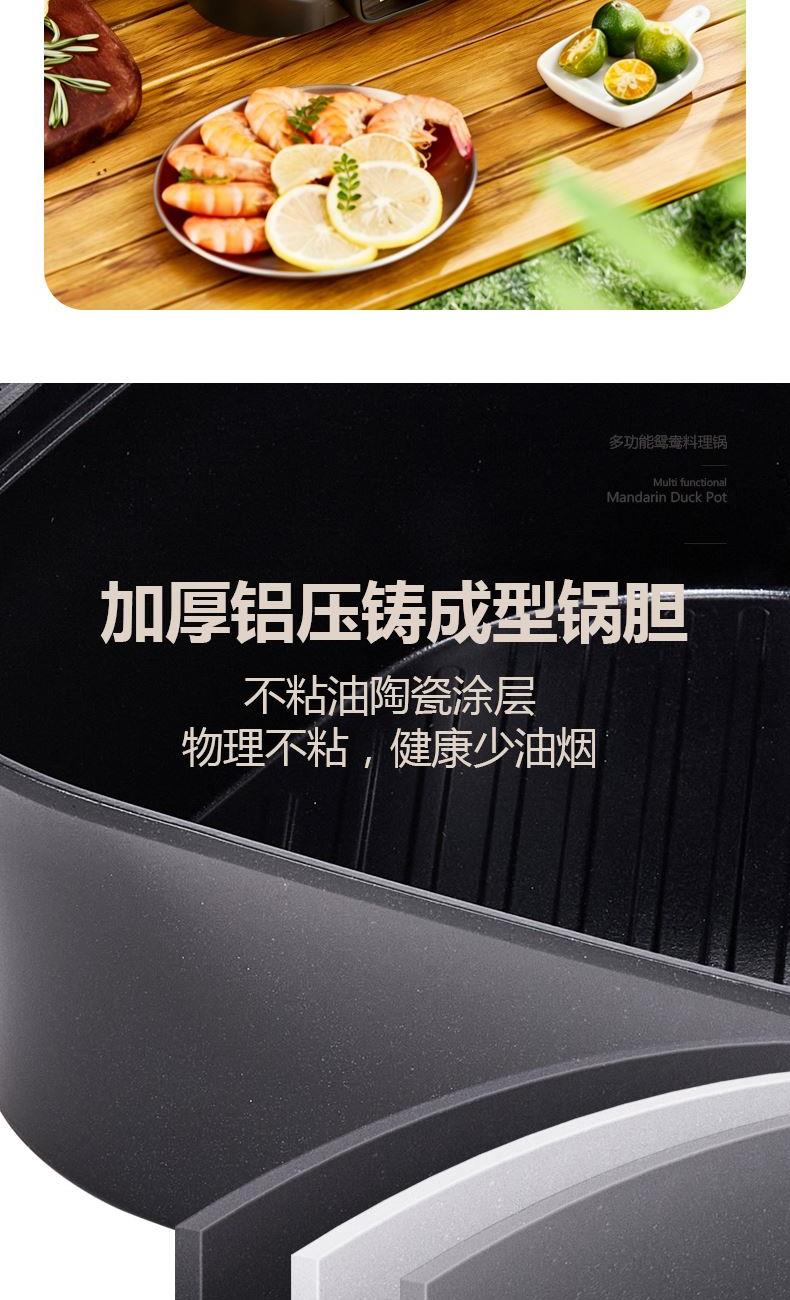 1、分體式鴛鴦鍋膽,壓鑄鋁工藝,不粘噴涂,清洗方便;