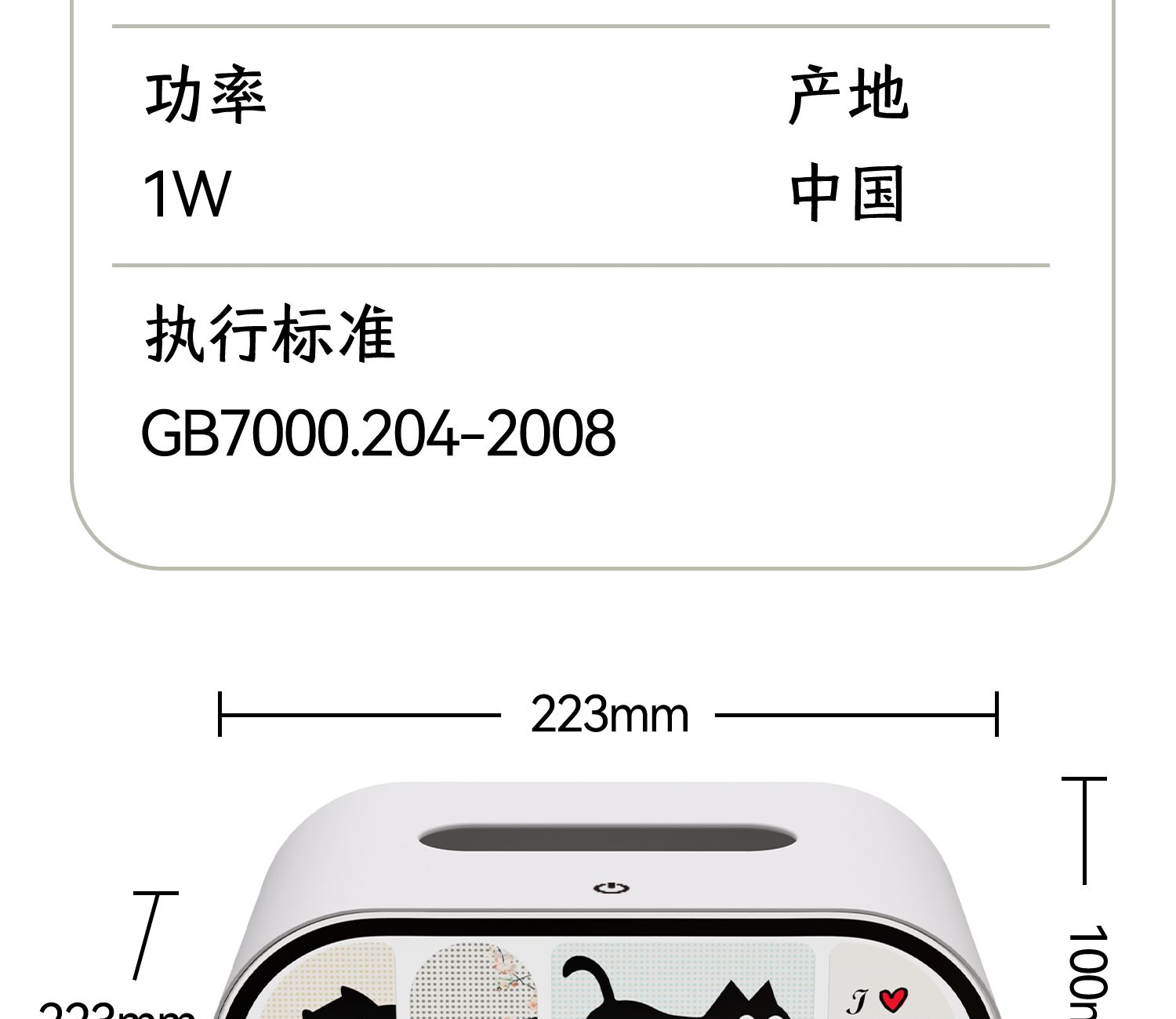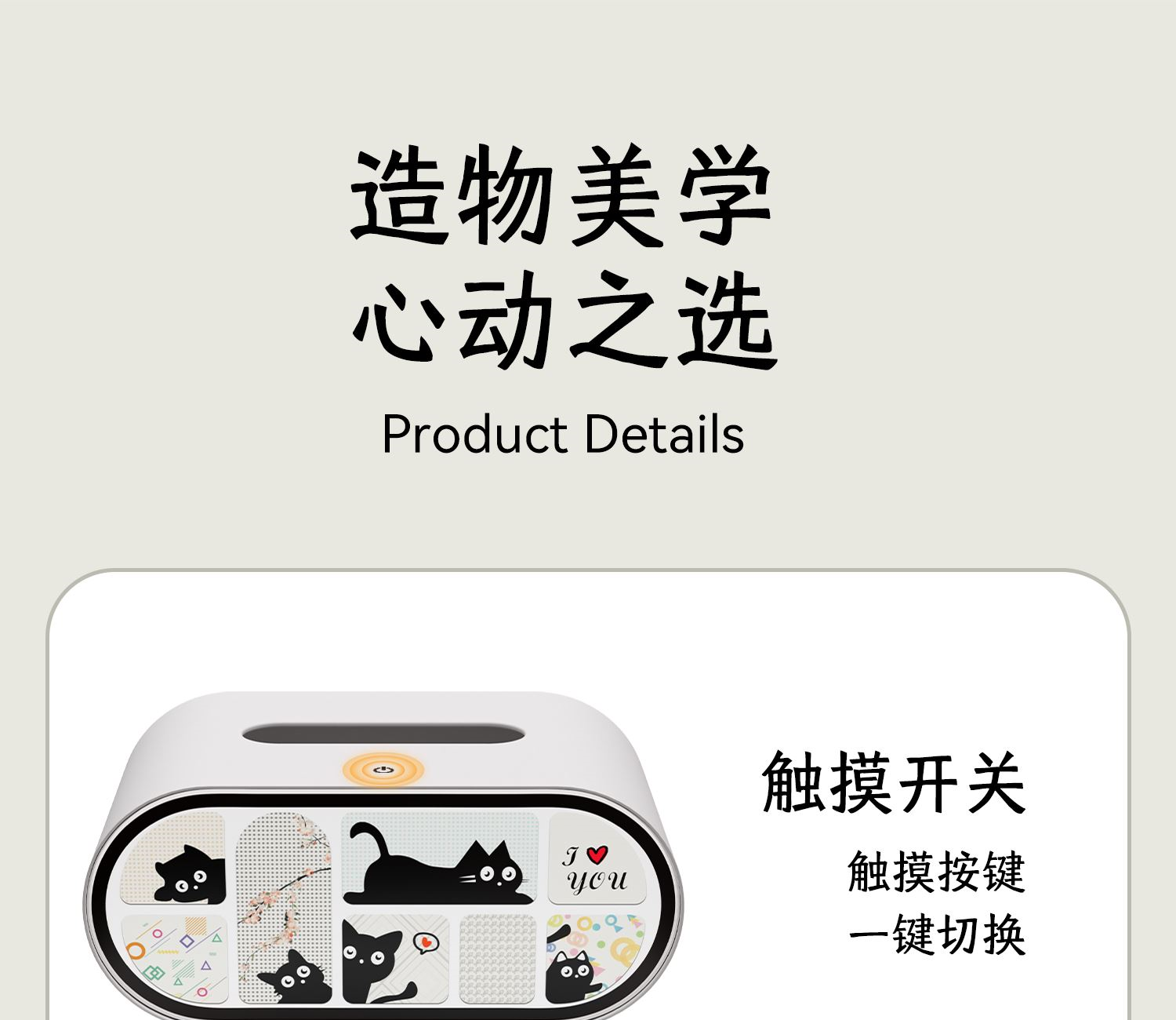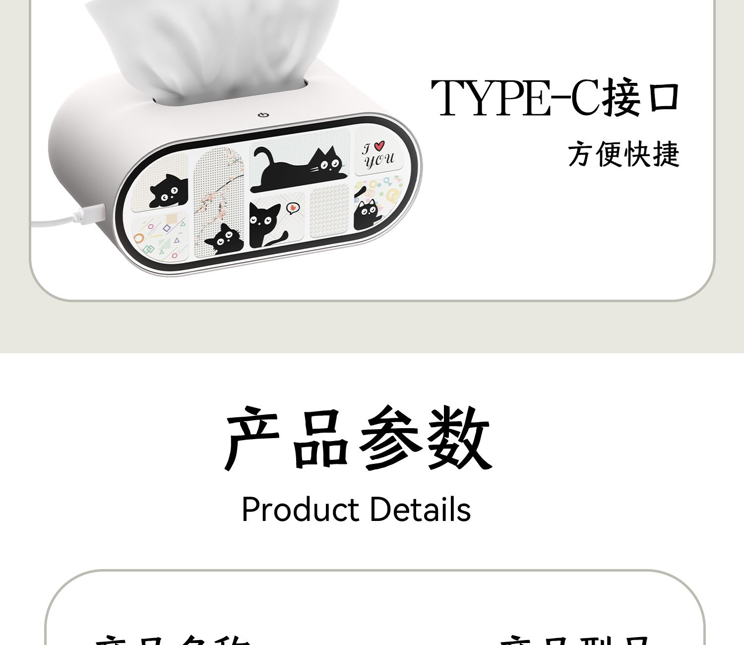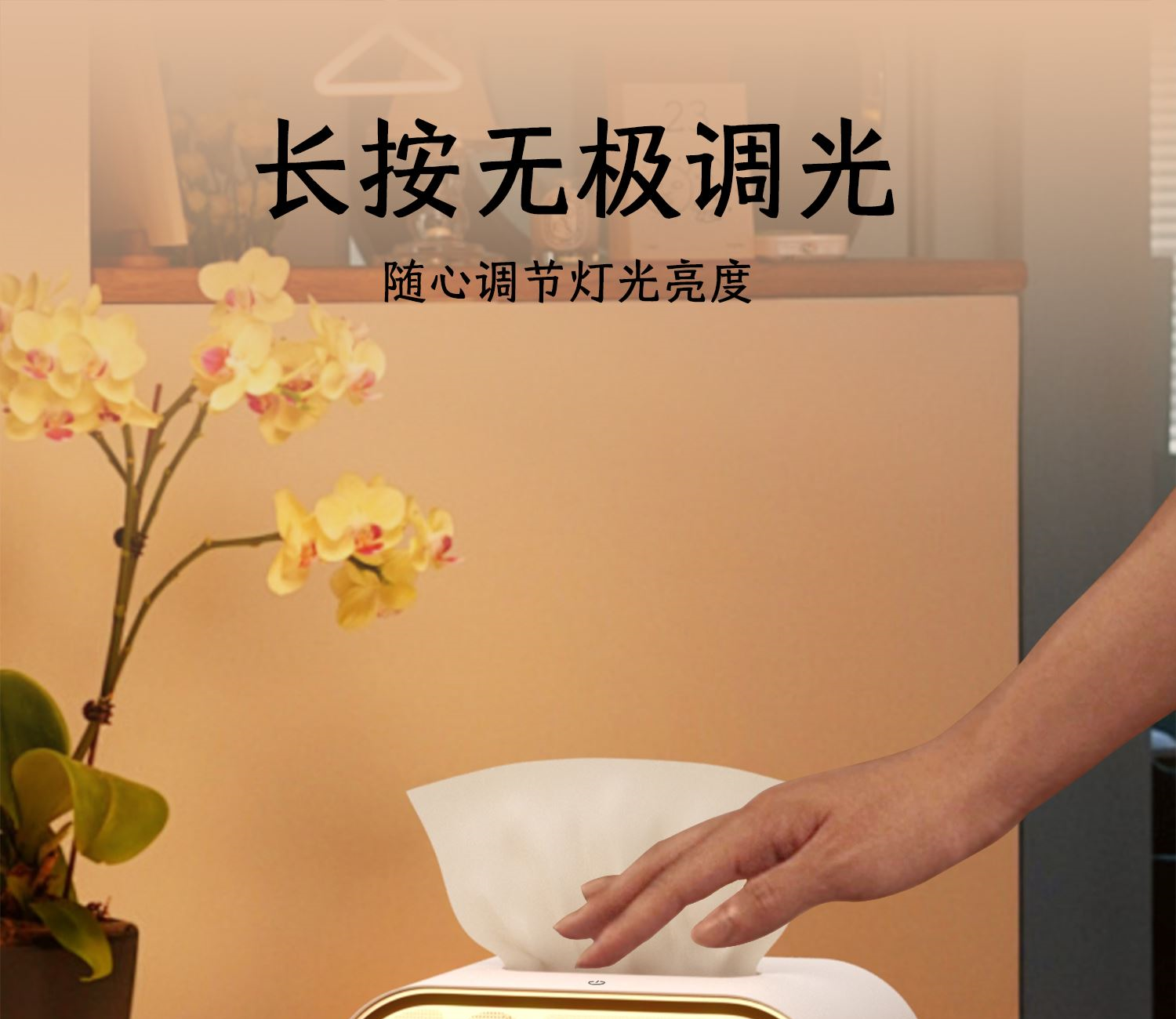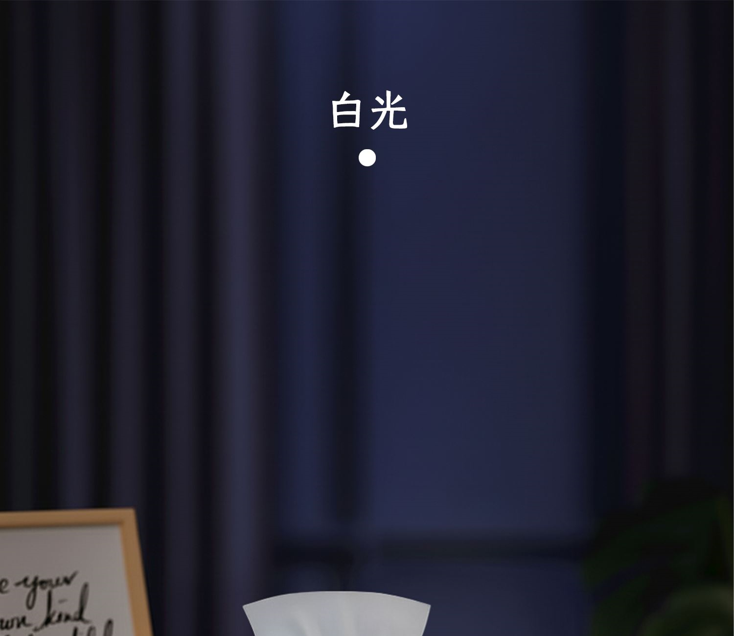 【顏色】白色 【材質(zhì)】ABS/PMMA/電子元件 【產(chǎn)品尺寸】223x100x132mm 【包裝尺寸】224*105*137mm 【電源輸入】 5V/1A 【電池容量】1200毫安 【產(chǎn)品重量】337/445g 顛覆性創(chuàng)新紙巾盒,紙巾盒的光影藝術(shù),匠心品質(zhì),輕奢格調(diào),方圓搭配美學 加大出紙口,順滑抽紙不卡頓 隨心調(diào)節(jié)燈光亮度,觸摸開光,三色燈光,