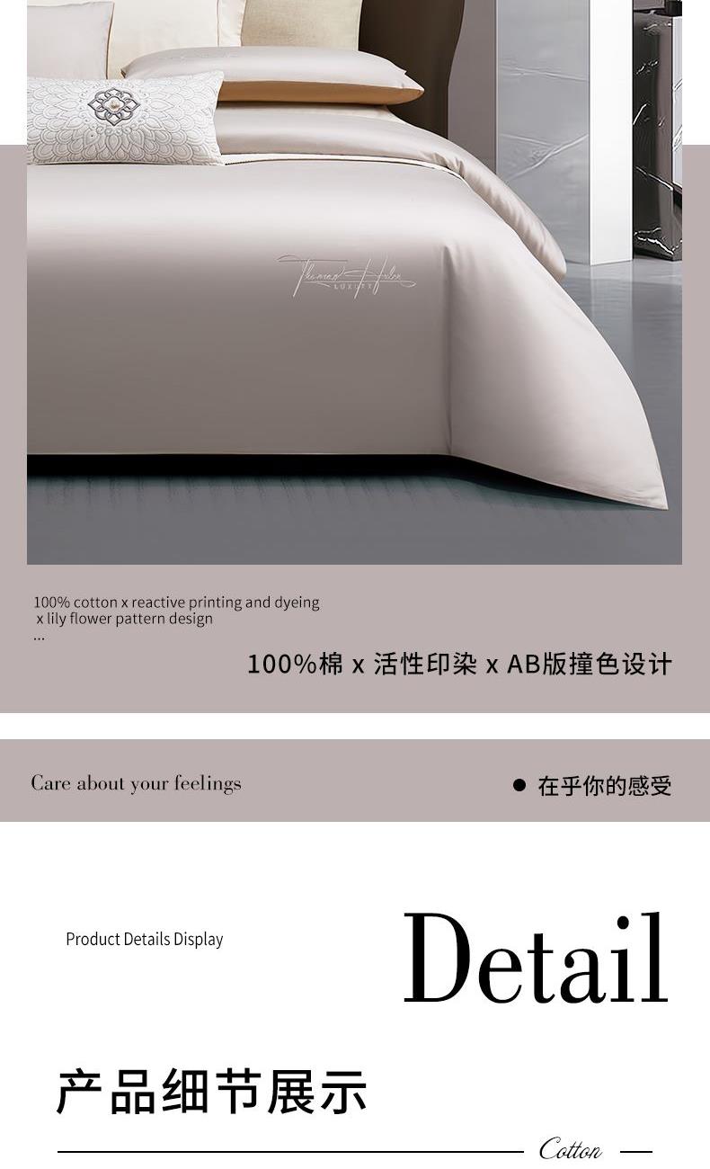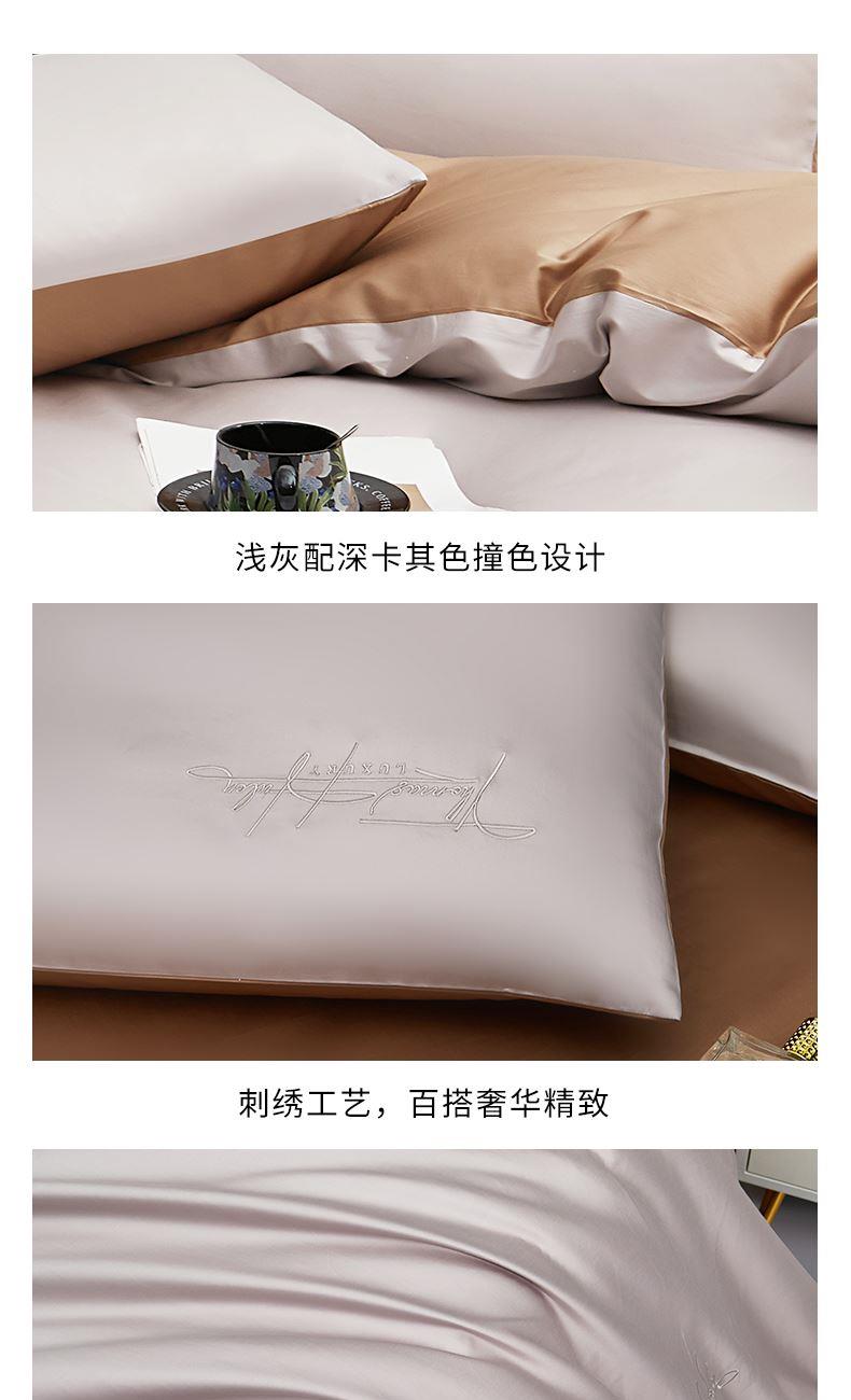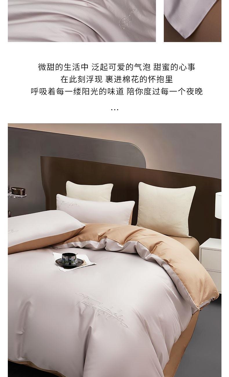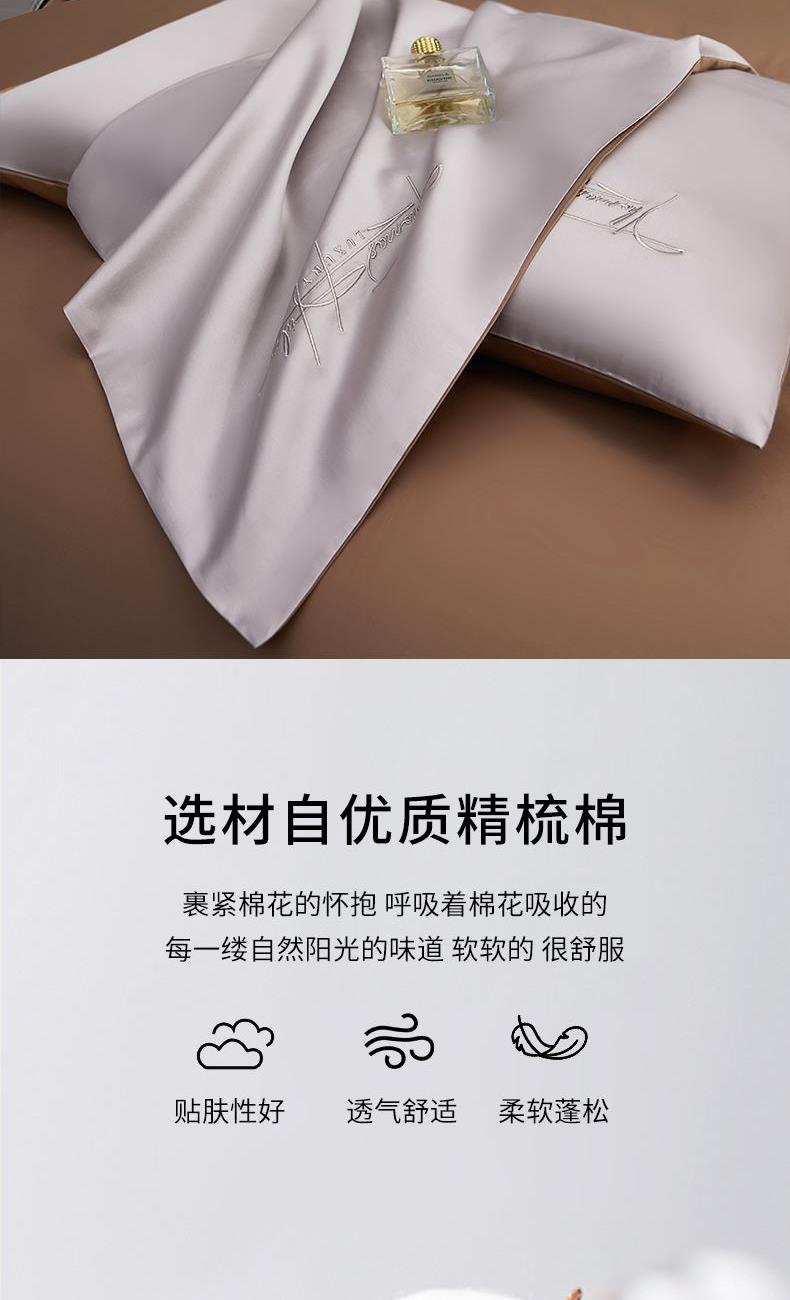 產(chǎn)品型號:S02025004 被 套:200*230cm 床 單:240*250cm 枕 套:48*74cm*2 面 料:棉 裝 箱 數(shù):7 純棉精梳棉面料,G-SOFT印染工藝,面料光澤度好、柔軟、順滑; AB版撞色設(shè)計,淺灰配深卡其色,刺繡工藝,百搭奢華精致; 天地蓋禮盒包裝,自用送禮兩相宜。