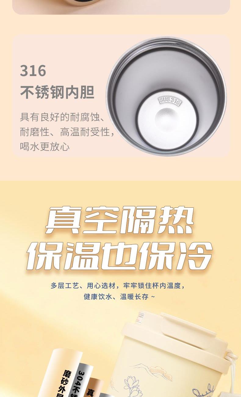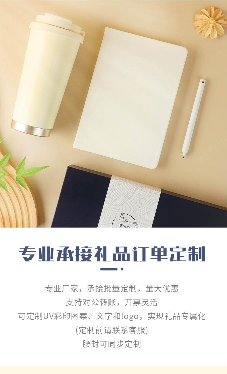 1.覓芳境--雙飲咖啡杯 容量:500ml 內(nèi)膽:316 外殼:304 杯蓋:食品級PP 吸管:食品級硅膠 吸嘴:食品級PP 密封圈:食品級硅膠 2.自潔轉(zhuǎn)動簽字筆 規(guī)格:0.5mm 3.A5平裝筆記本 規(guī)格:80張100克太陽紙 (64張點格紋,16張空白紙張) 禮盒尺寸:340*255*100(MM) 手提袋尺寸:350*265*110(MM)