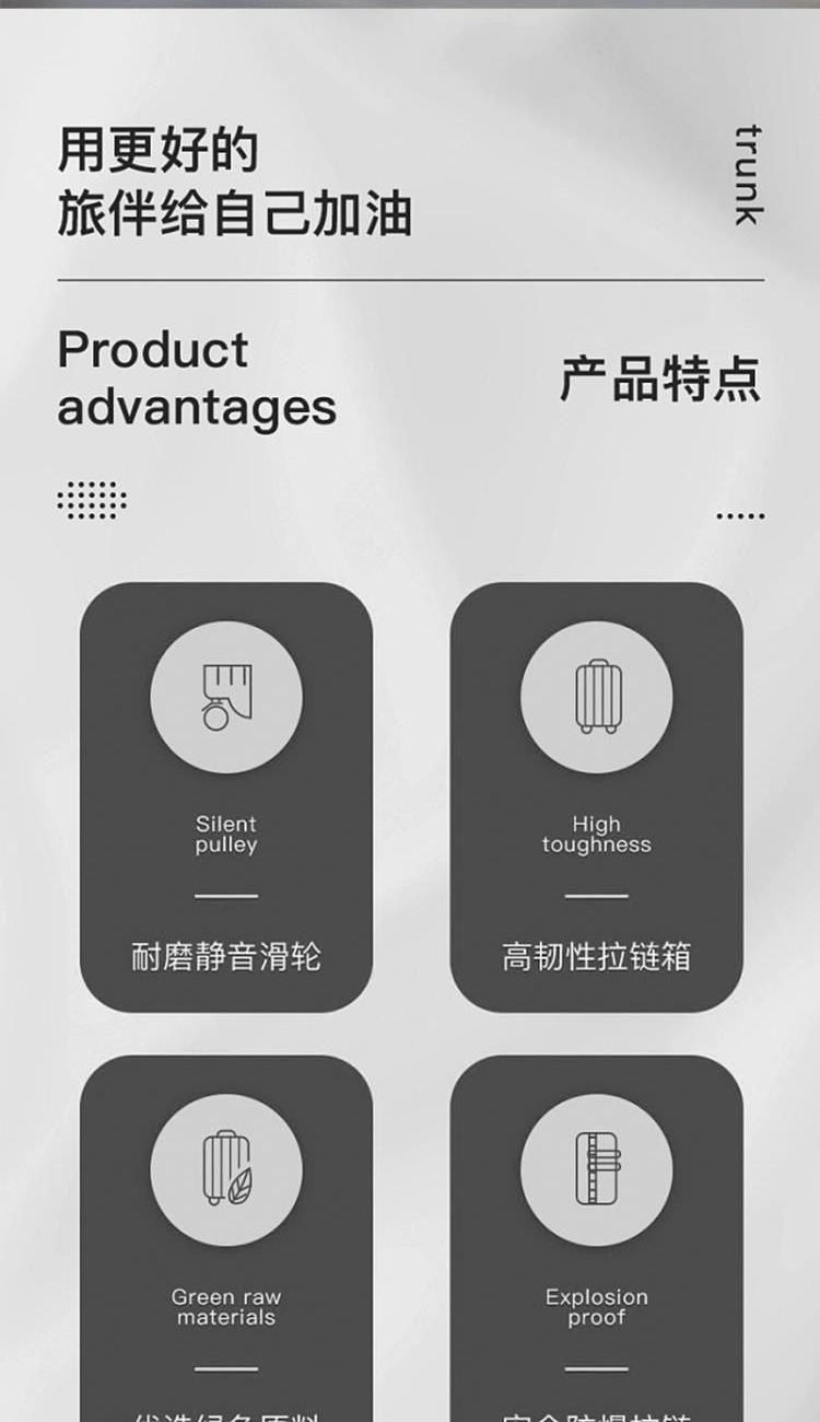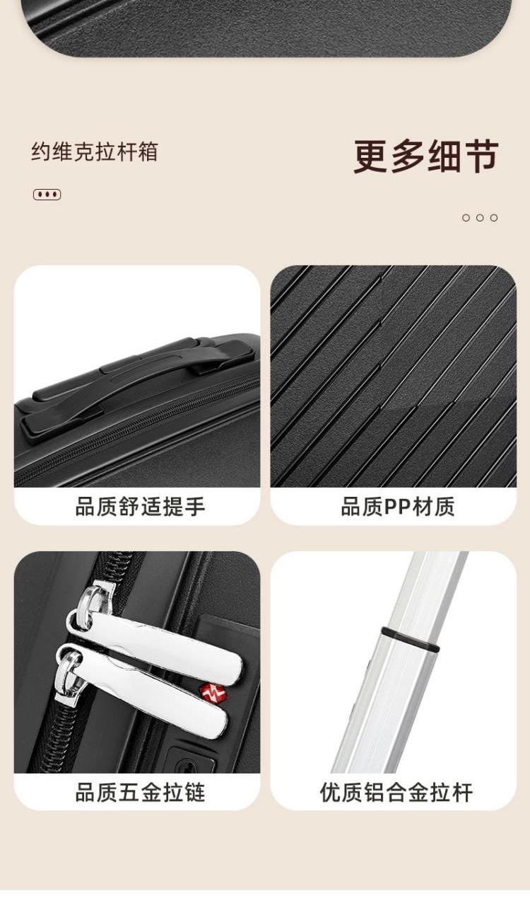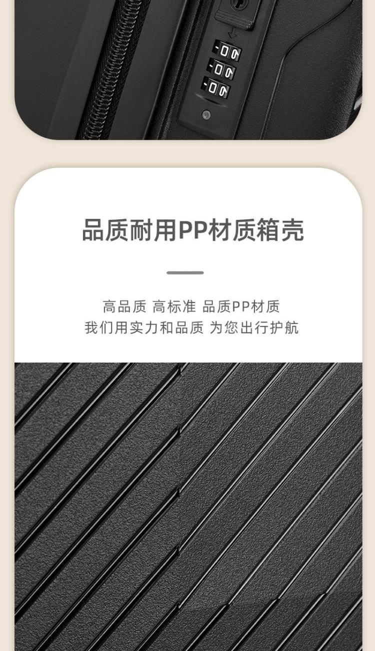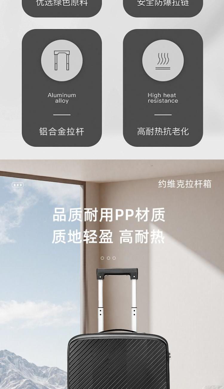 產(chǎn)品賣點(diǎn):PP材質(zhì),結(jié)晶度高,拉桿箱表面更加強(qiáng)硬,可以有效的防止磕碰造成劃痕,而且耐沖擊和防水性好;