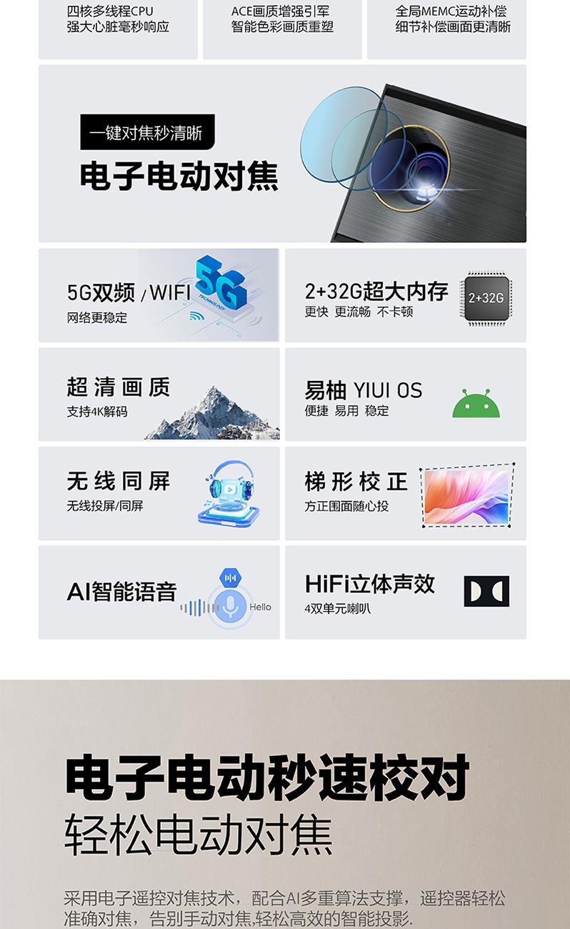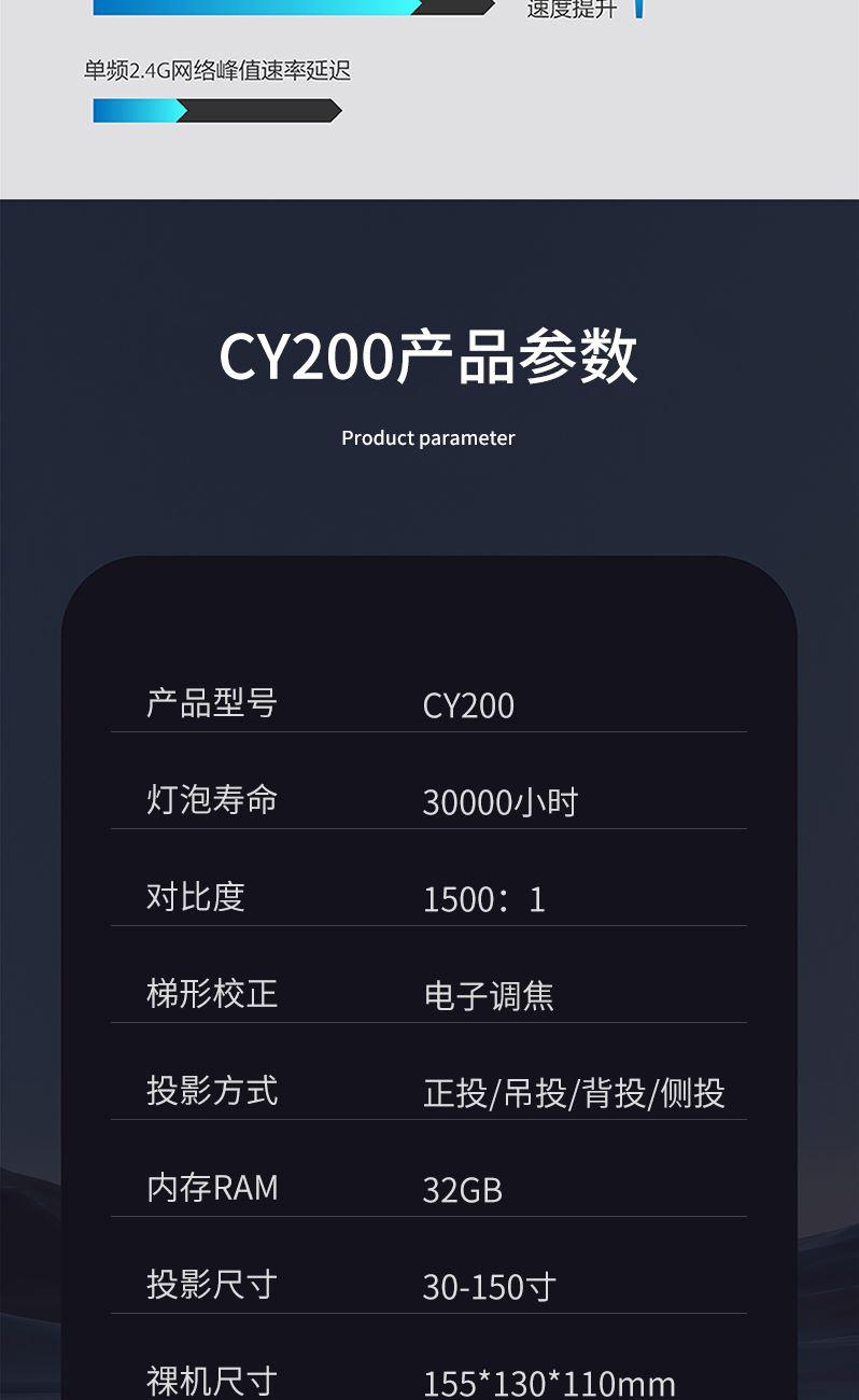 產(chǎn)品型號(hào):CY200 燈泡壽命:30000小時(shí) 對(duì)比度:1500:1 梯形校正:電子調(diào)焦 投影方式:正投/吊投/背投/側(cè)投 內(nèi)存RAM:32GB 投影尺寸:30-150寸 裸機(jī)尺寸:155*130*110mm