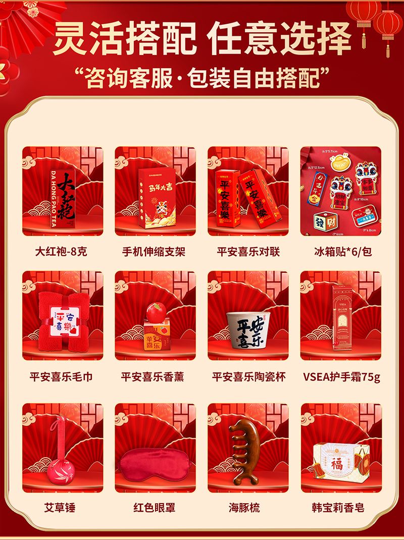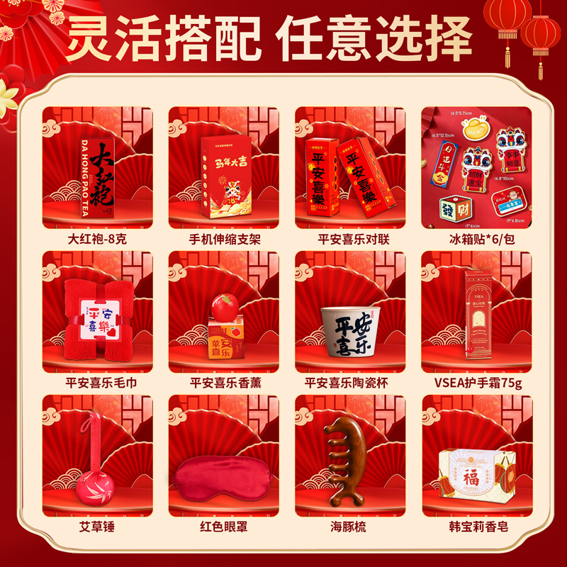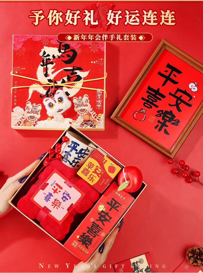 禮盒尺寸(20*20*10cm) 禮袋尺寸(25*22*12cm) 產(chǎn)品配置: 平安喜樂(lè)香薰 小罐茶8g 平安喜樂(lè)毛巾 護(hù)手霜45g 新年對(duì)聯(lián)(一對(duì)裝)