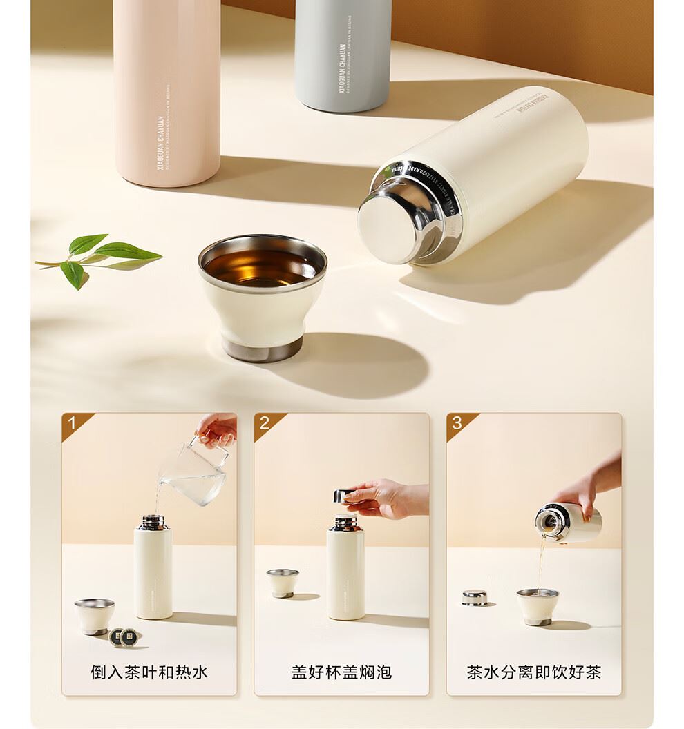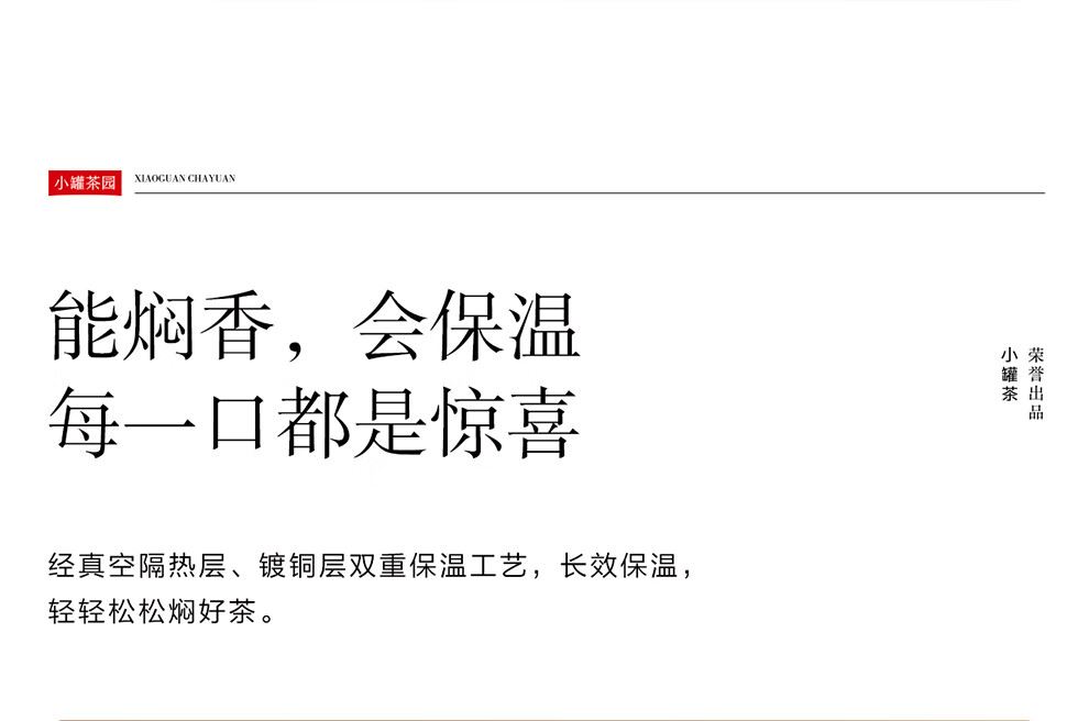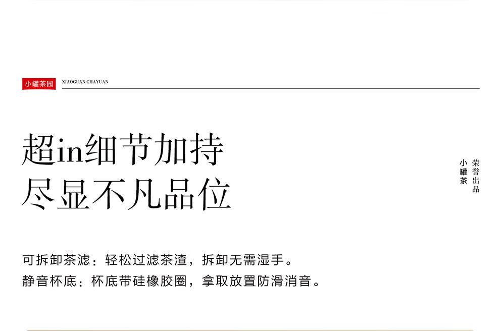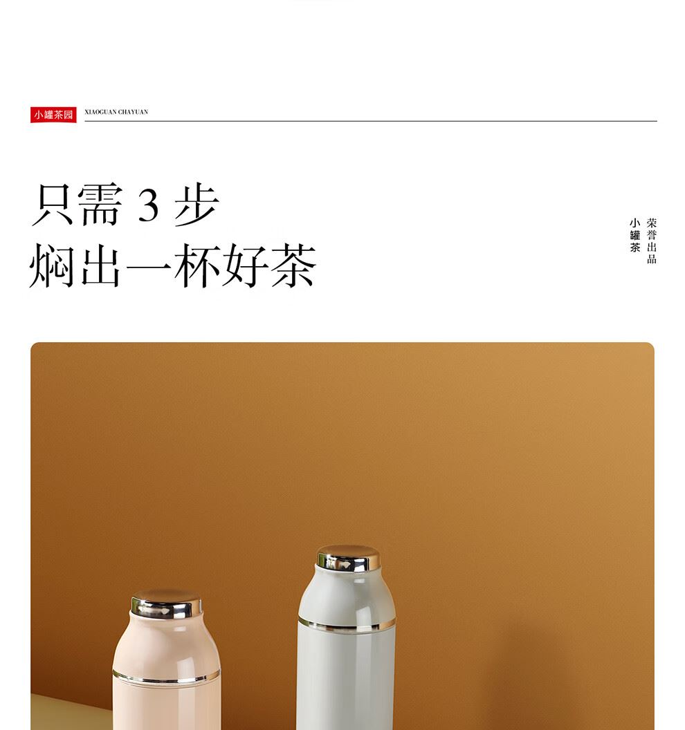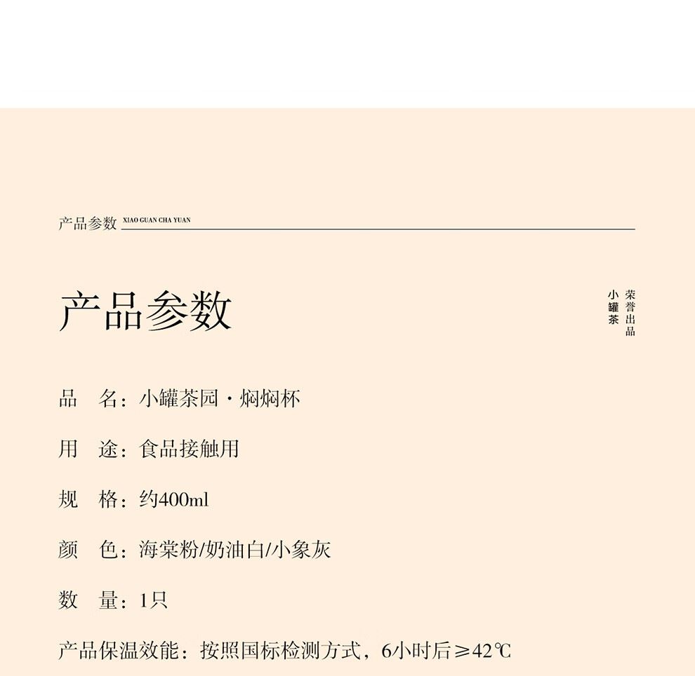 小罐茶旗下生活茶品pai | 小罐茶園 摩登燜杯 保溫鎖香 400ml容量 | 便捷燜泡 | 復(fù)古百搭 保溫保冷 | 燜泡皆可 | 四季適用 烤漆工藝 時(shí)尚五色 百搭又吸睛 漆面均勻、色彩飽滿,五色可選,整體氣質(zhì)復(fù)古摩登 夏季冷泡茶 冬季熱燜茶 這一杯 四季適用 能燜香,會(huì)保溫 每一口都是驚喜 經(jīng)真空隔熱層、鍍銅層雙重保溫工藝,長效保溫,輕輕松松燜好茶。 磁吸杯蓋設(shè)計(jì) 既是杯蓋又是茶杯 磁吸杯蓋,開合干脆利落,既是杯蓋又是茶盞;雙層敞口造型,端茶不燙手,喝茶更自在。 超in細(xì)節(jié)加持 盡顯不凡品位 可拆卸茶濾,輕松過濾茶渣,拆卸無需濕手。 靜音杯底,杯底帶硅橡膠圈,拿取放置防滑消音。 燜泡茶更香 喝茶有溫度 戶外/旅行/出差/居家,燜杯好茶慢慢喝。 品ming:小罐茶園·燜燜杯 用途:食品接觸用 規(guī)格:約400ml 顏色:海棠粉/奶油自/小象灰(三色可選) 數(shù)量:1只 出品方:北京小罐茶業(yè)有限公司