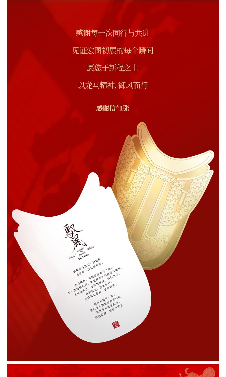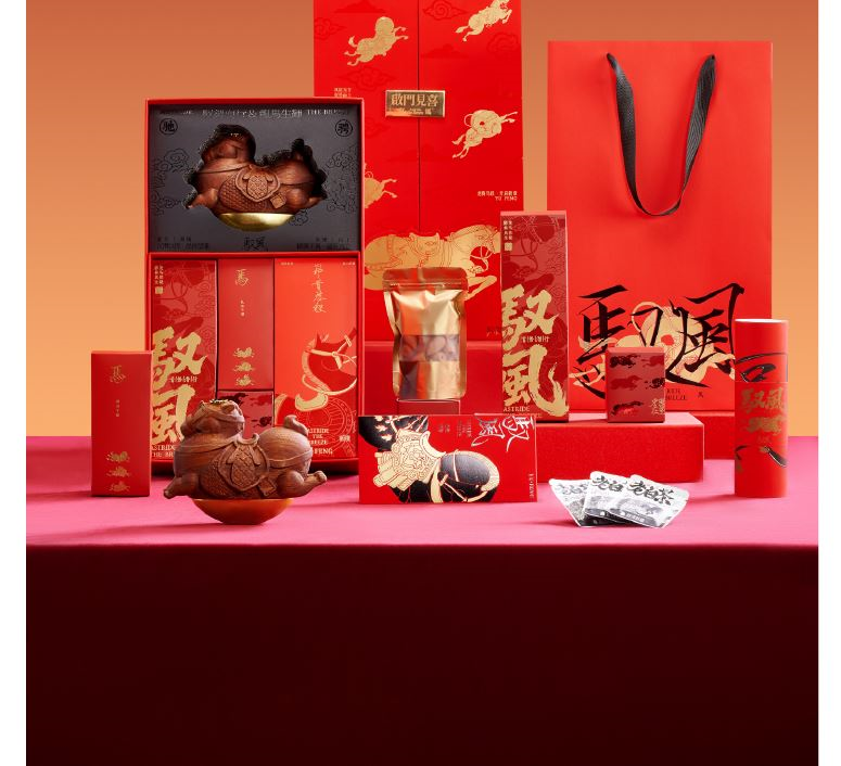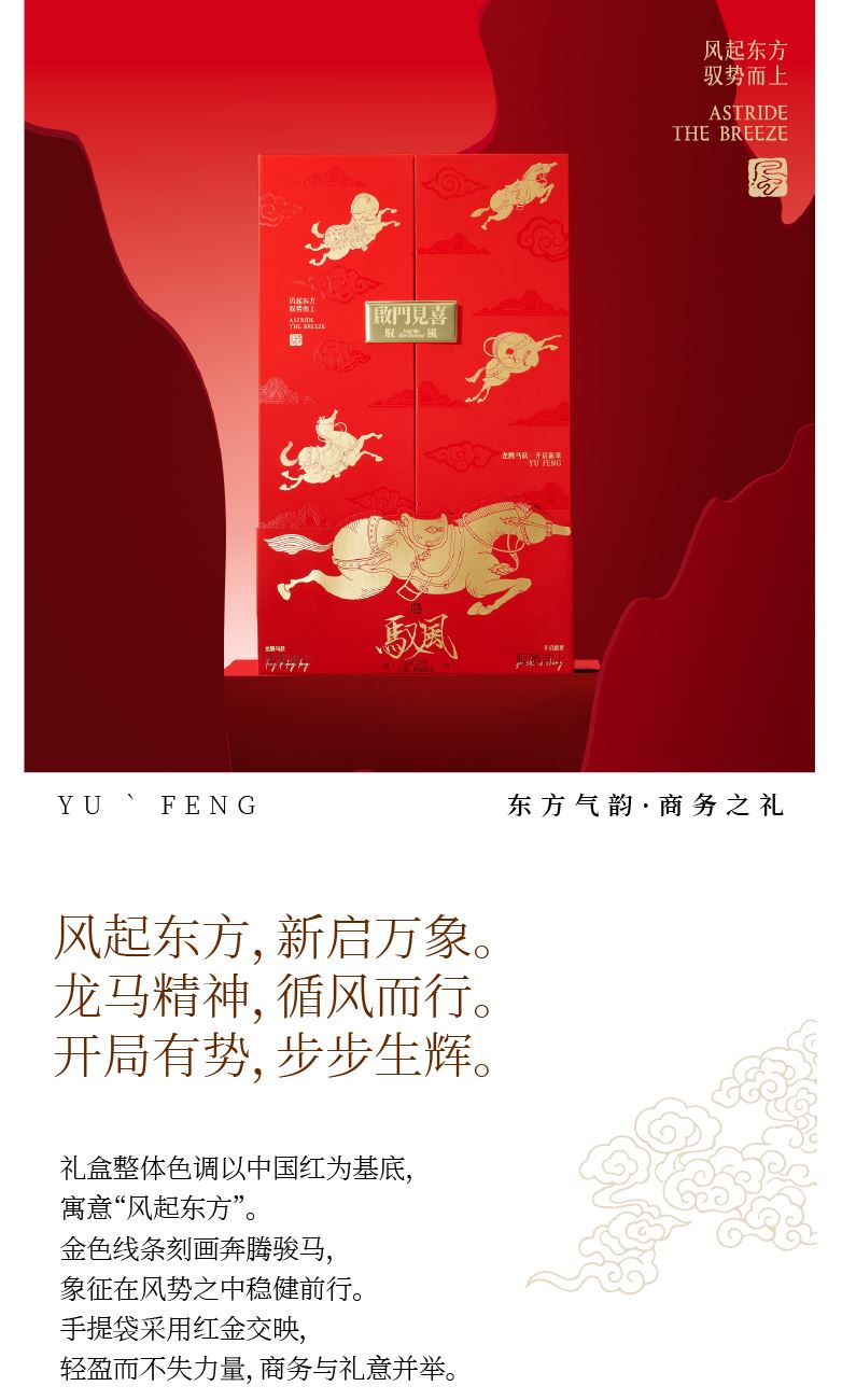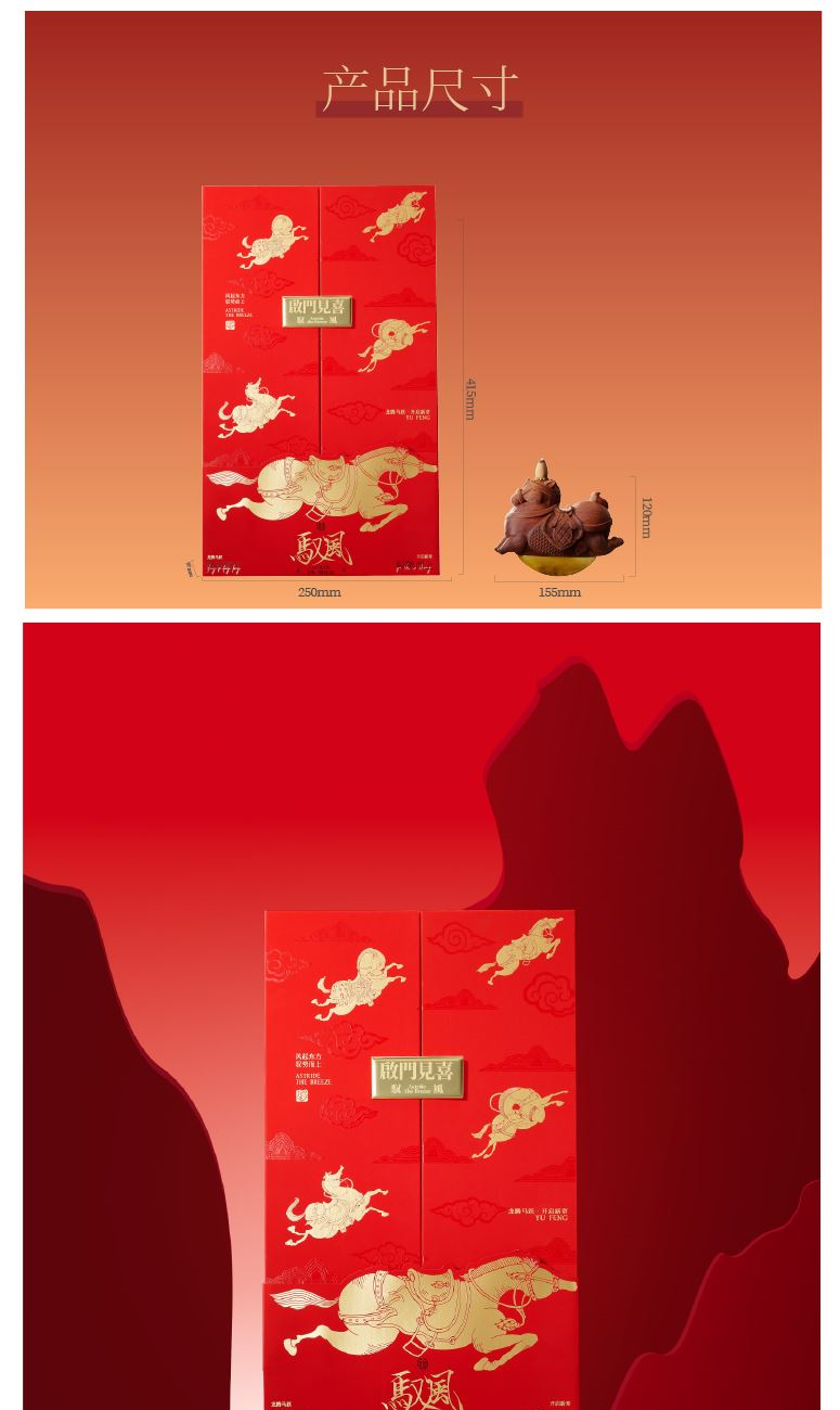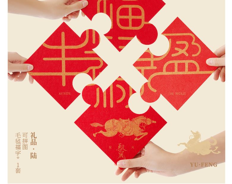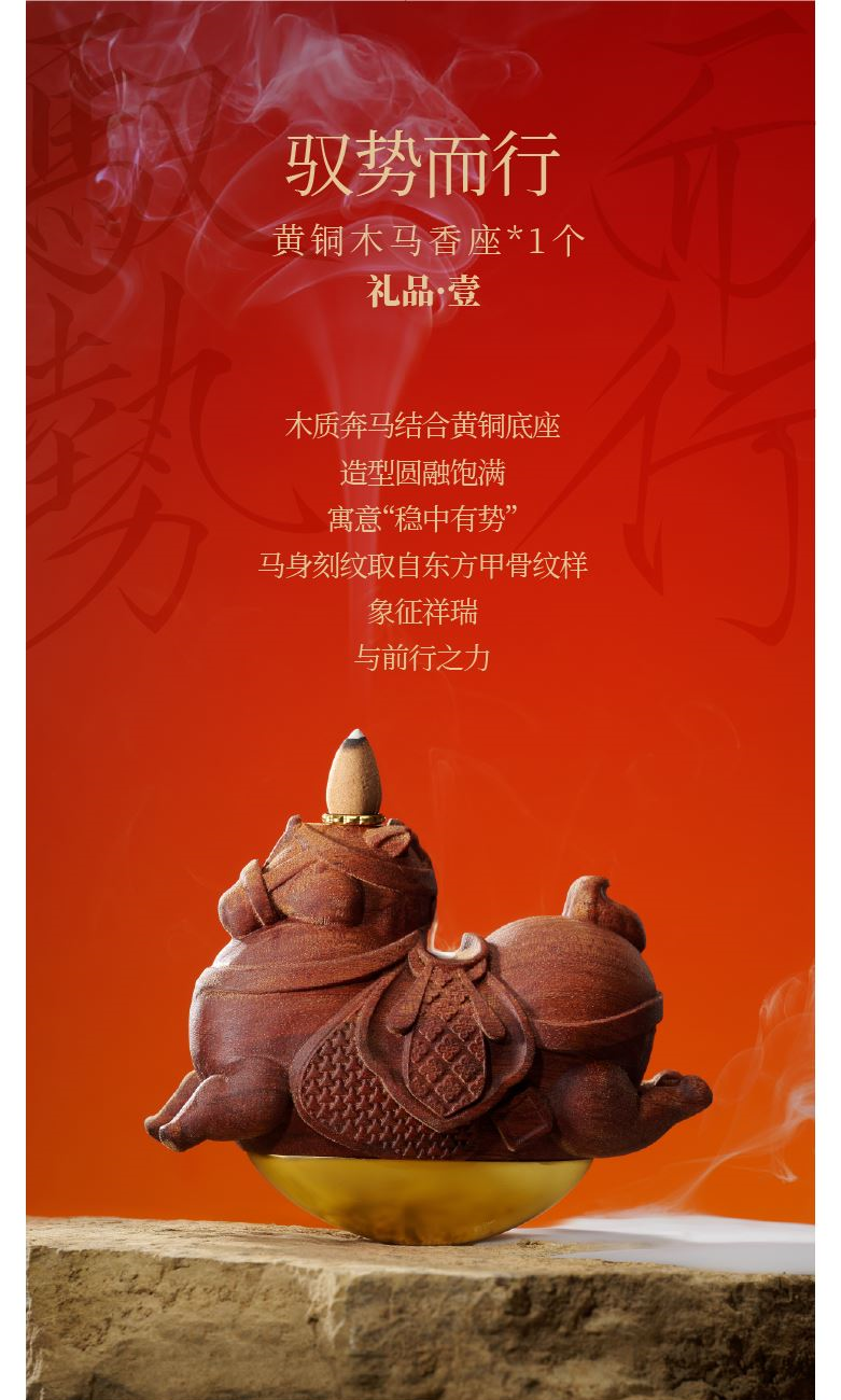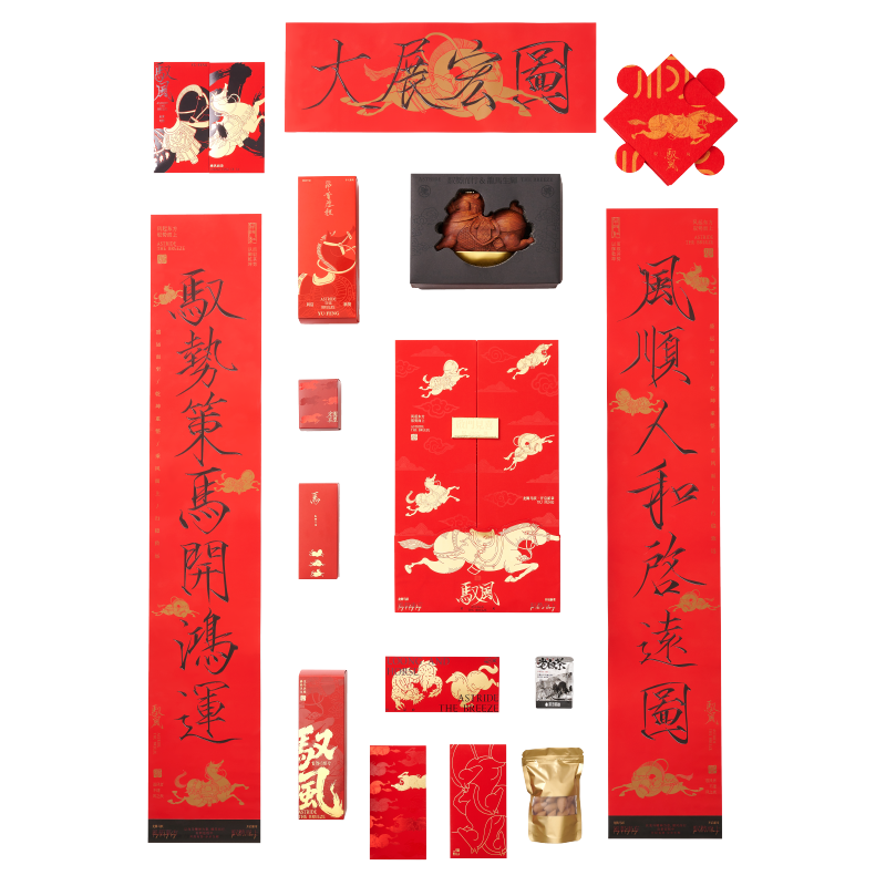 【馭風主題紙盒】 1、 [馭勢而行]原創(chuàng)木馬香座*1個 2、 [奔騰萬里]檀香倒流香粒*1盒 3、 [宏圖在望]非遺大師白茶片*10片 4、 [福祿豐盈]可拼圖毛氈福字*1套 5、 [乘風而發(fā)]原創(chuàng)主題紅包*1套 6、 [大展宏圖]原創(chuàng)主題對聯*1套