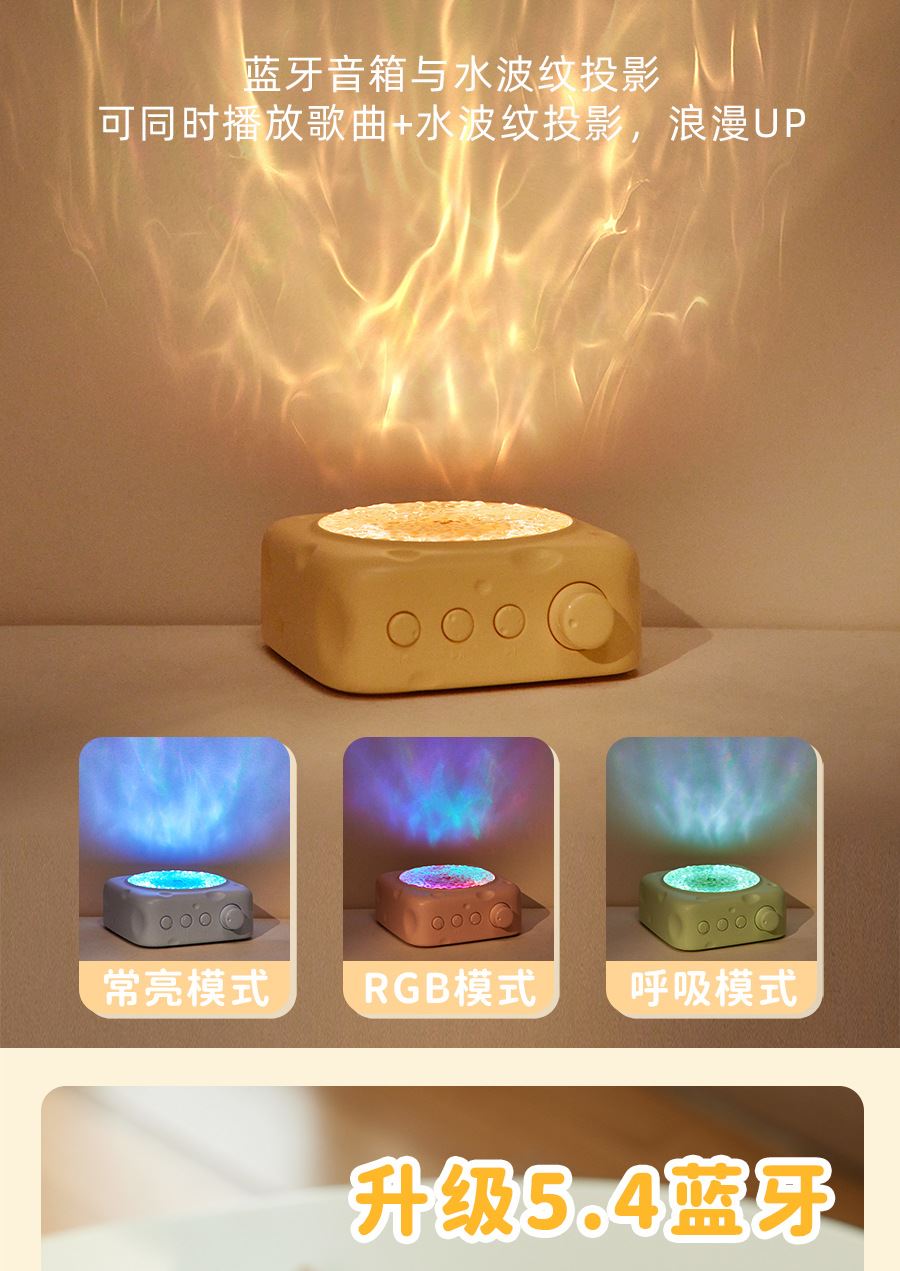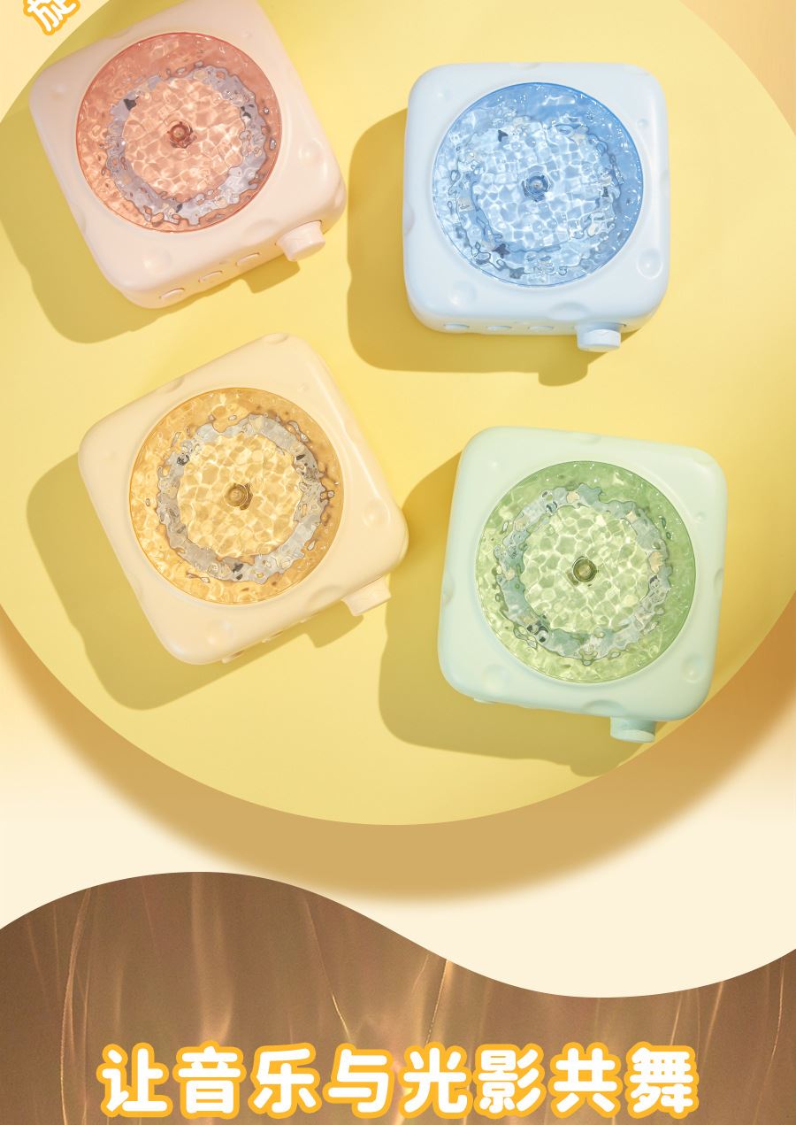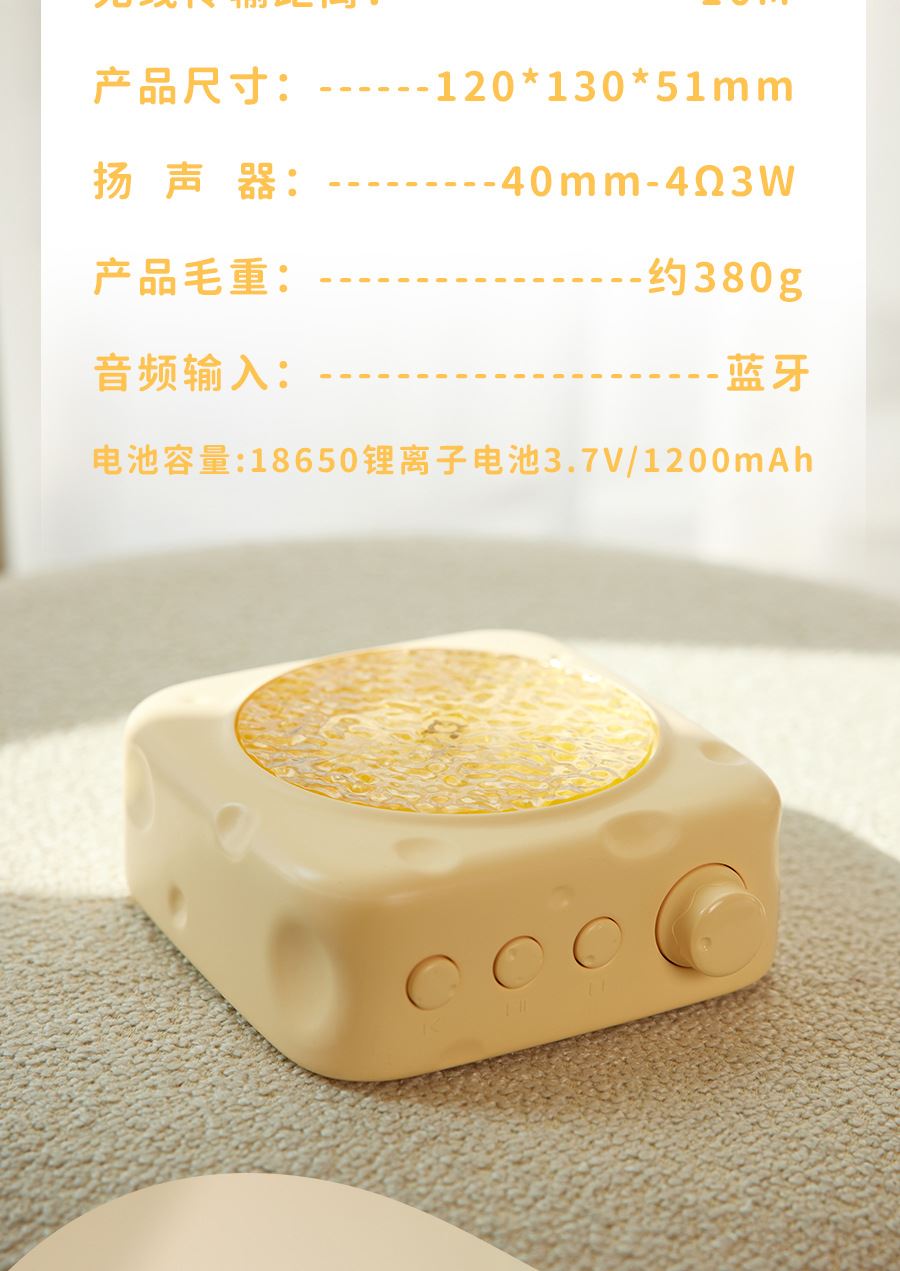 【顏色】黃色、綠色、藍(lán)色、粉色 【功率】5W 【藍(lán)牙版本】5.4【材質(zhì)】ABS 【播放模式】藍(lán)牙 【無(wú)線充輸出】3W 【電池容量】1200mAh 【凈重毛重】380g 【產(chǎn)品尺寸】120*130*51mm 【包裝尺寸】156*140*62mm 水波旋律氛圍燈,奶酪投影,3種燈光模式 高透ABS轉(zhuǎn)盤(pán),清透質(zhì)感,透光性強(qiáng) 后置音腔,立體音質(zhì)