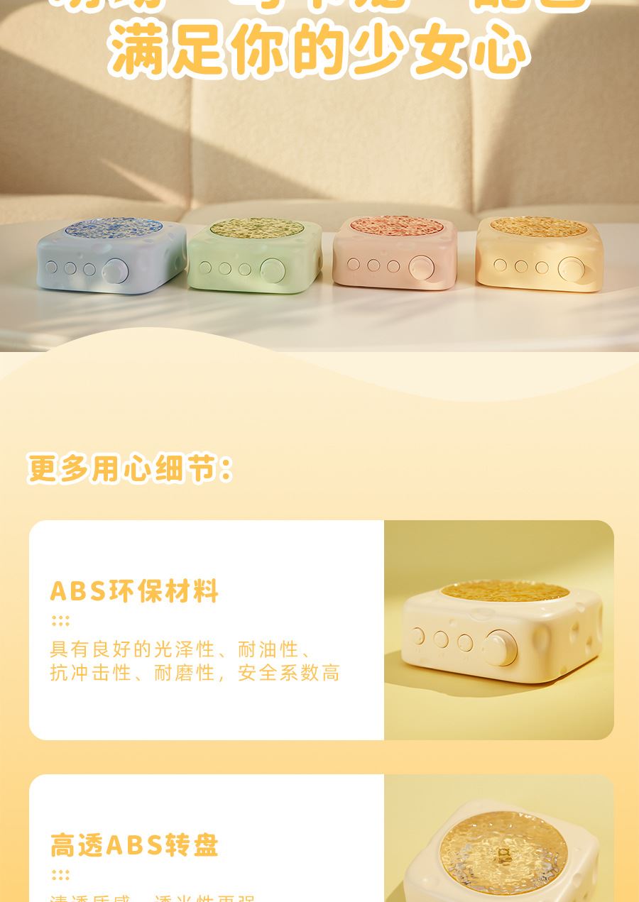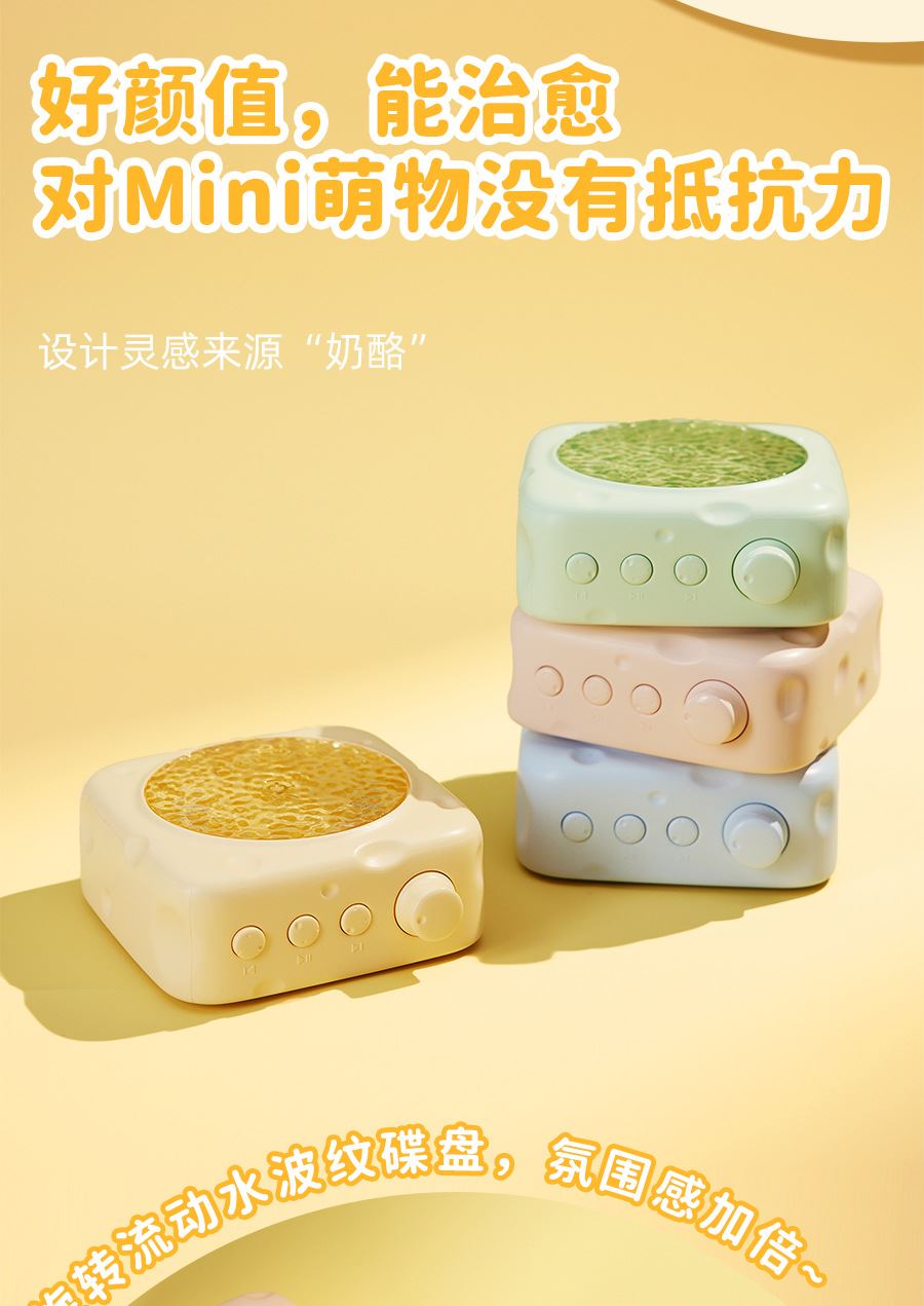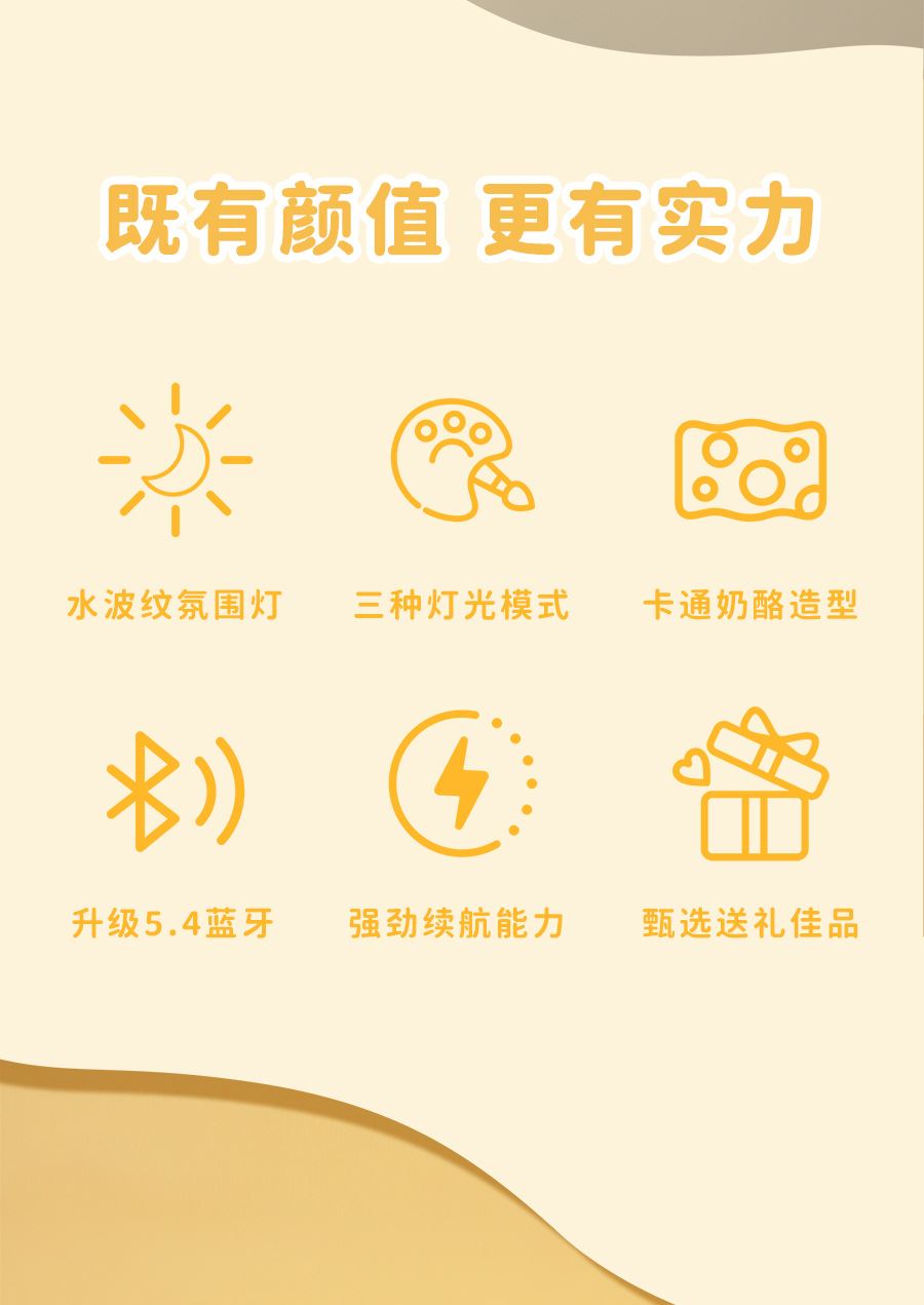【顏色】黃色、綠色、藍(lán)色、粉色 【功率】5W 【藍(lán)牙版本】5.4【材質(zhì)】ABS 【播放模式】藍(lán)牙 【無(wú)線充輸出】3W 【電池容量】1200mAh 【凈重毛重】380g 【產(chǎn)品尺寸】120*130*51mm 【包裝尺寸】156*140*62mm 水波旋律氛圍燈,奶酪投影,3種燈光模式 高透ABS轉(zhuǎn)盤(pán),清透質(zhì)感,透光性強(qiáng) 后置音腔,立體音質(zhì)