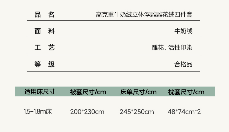 被套:200×230cm 床單:245×250cm 枕套:48×74cm 適用:1.5M-1.8M床 面料:牛奶絨(抗靜電) 風(fēng)格 : 簡(jiǎn)歐風(fēng)格 套件采用高克重雕花絨面料,24H保暖呵護(hù)整夜溫暖,柔軟細(xì)膩,貼膚保暖,面料植入導(dǎo)電絲,免去靜電煩惱,溫暖整個(gè)冬季。