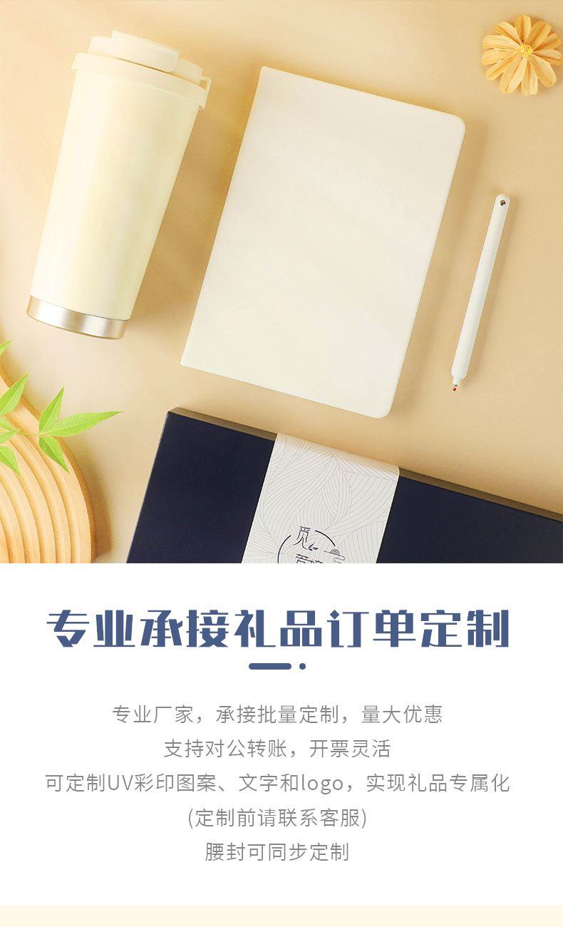 1.覓芳境--雙飲咖啡杯 容量:500ml 內(nèi)膽:316 外殼:304 杯蓋:食品級PP 吸管:食品級硅膠 吸嘴:食品級PP 密封圈:食品級硅膠 2.自潔轉(zhuǎn)動(dòng)簽字筆 規(guī)格:0.5mm 3.A5平裝筆記本 規(guī)格:80張100克太陽紙 (64張點(diǎn)格紋,16張空白紙張) 禮盒尺寸:340*255*100(MM) 手提袋尺寸:350*265*110(MM)